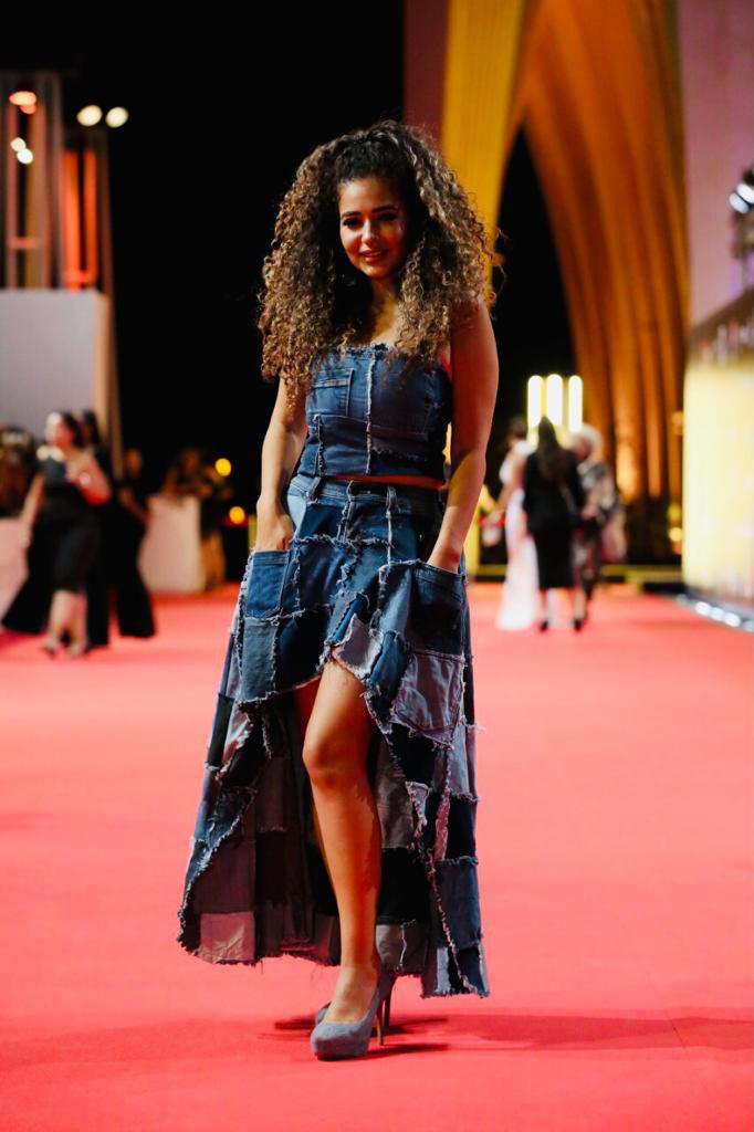 pieces of various colored jeans cut into 100 squares and sewn together to create this twin set ensemble.