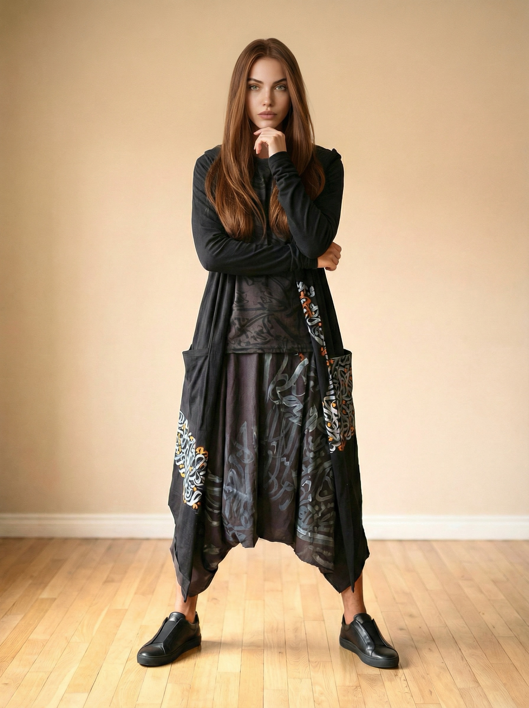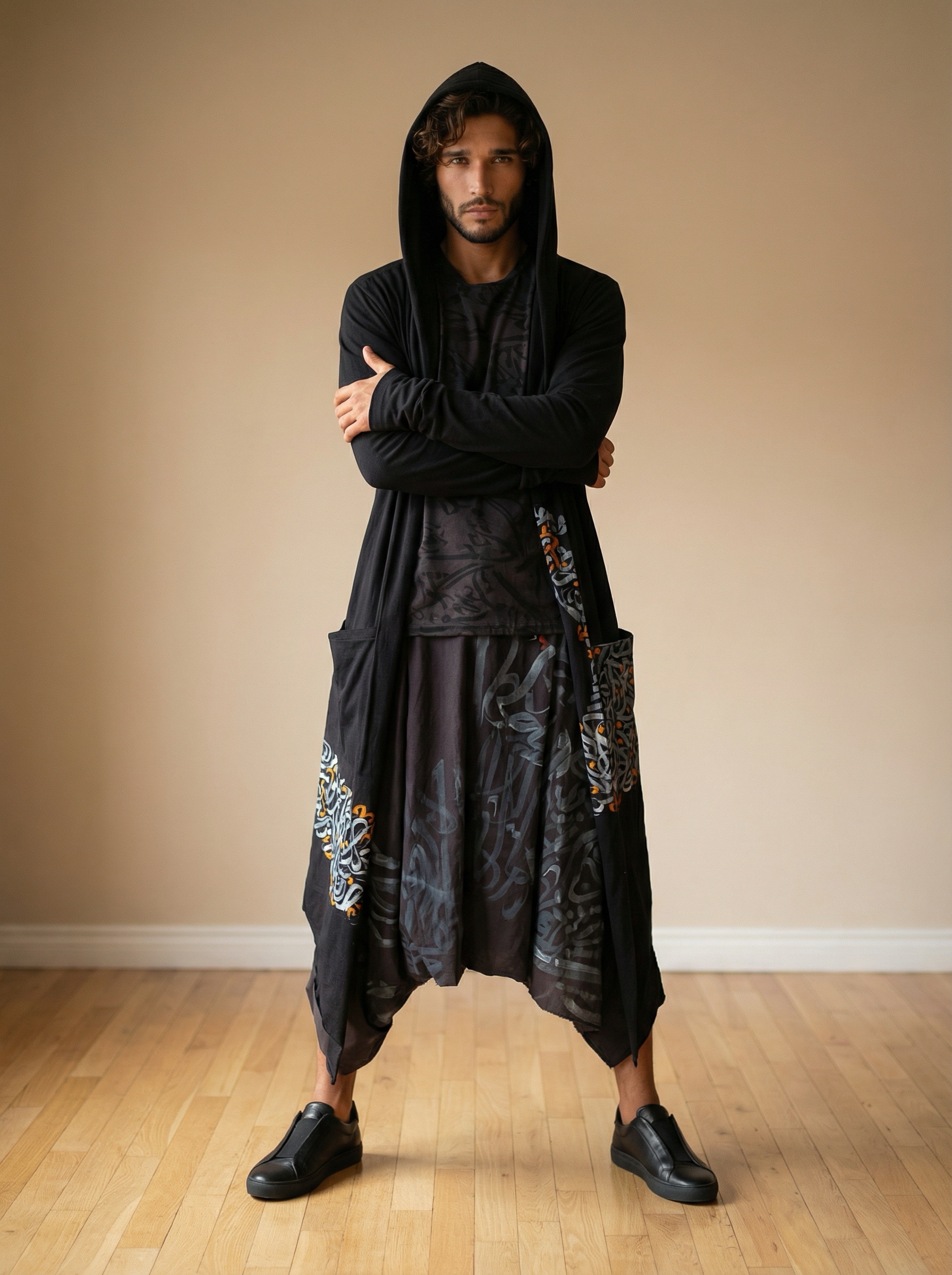 This set is a hoodie jacket with matching Sherwal pants, calligraphy written in silver and orange textile paint!