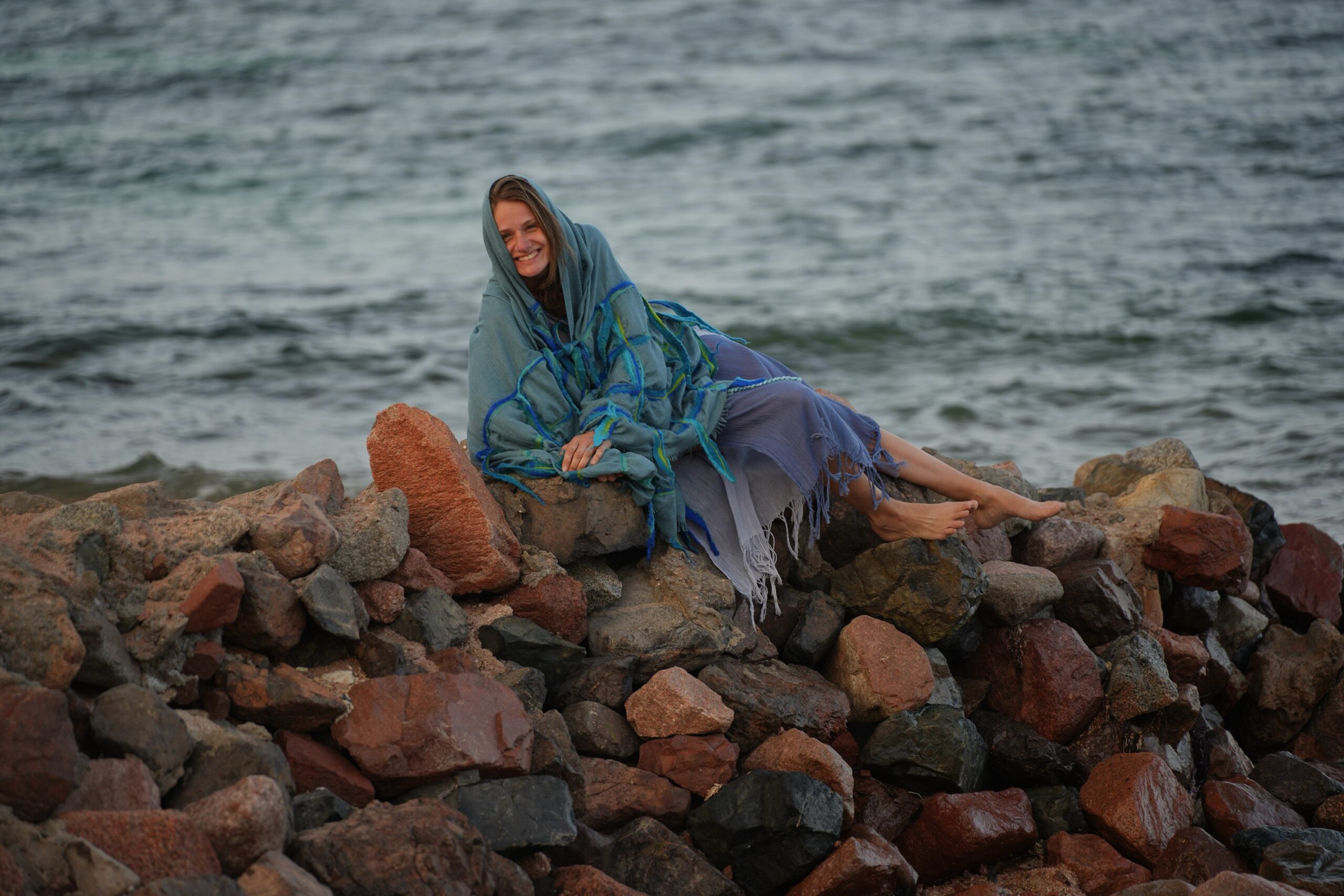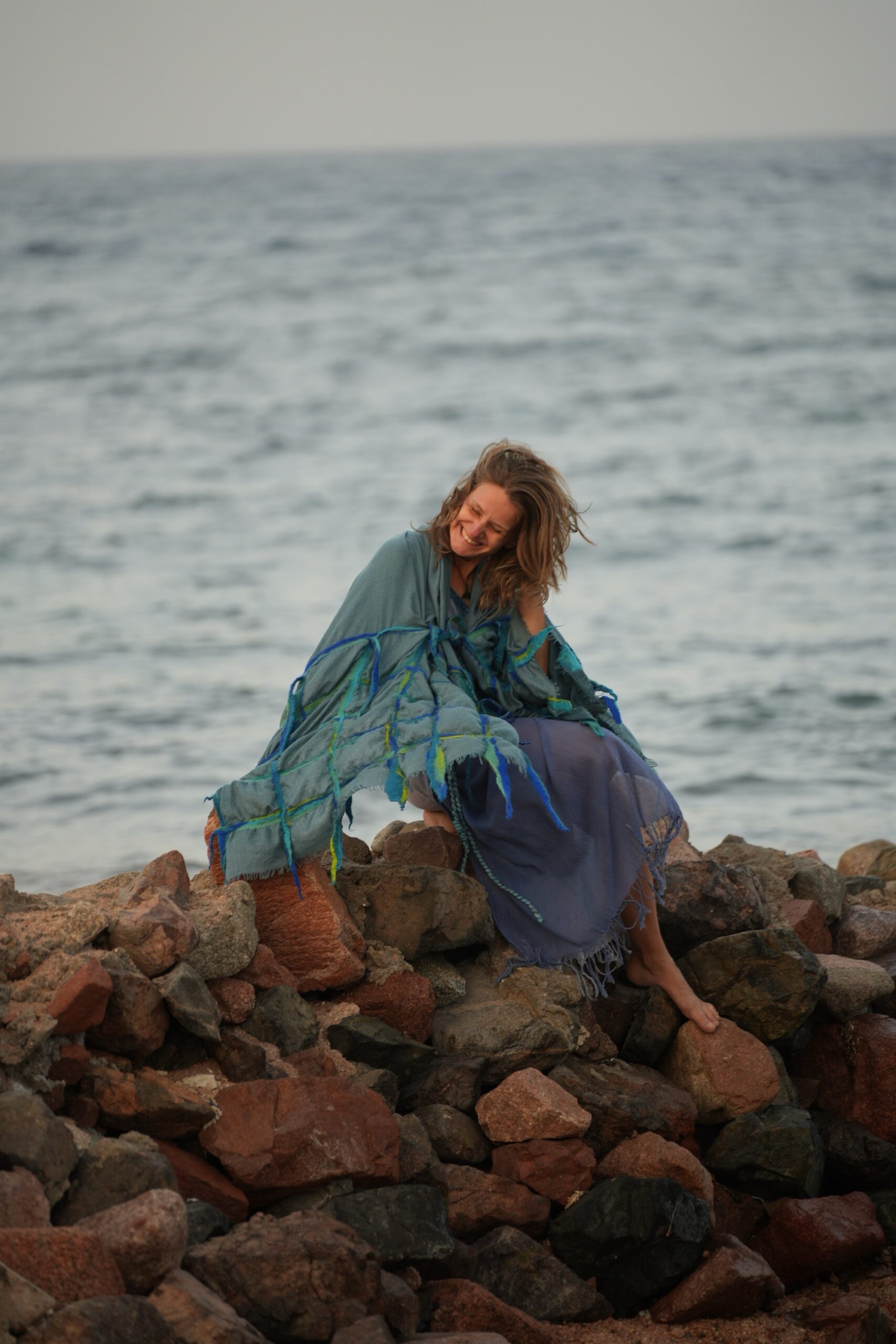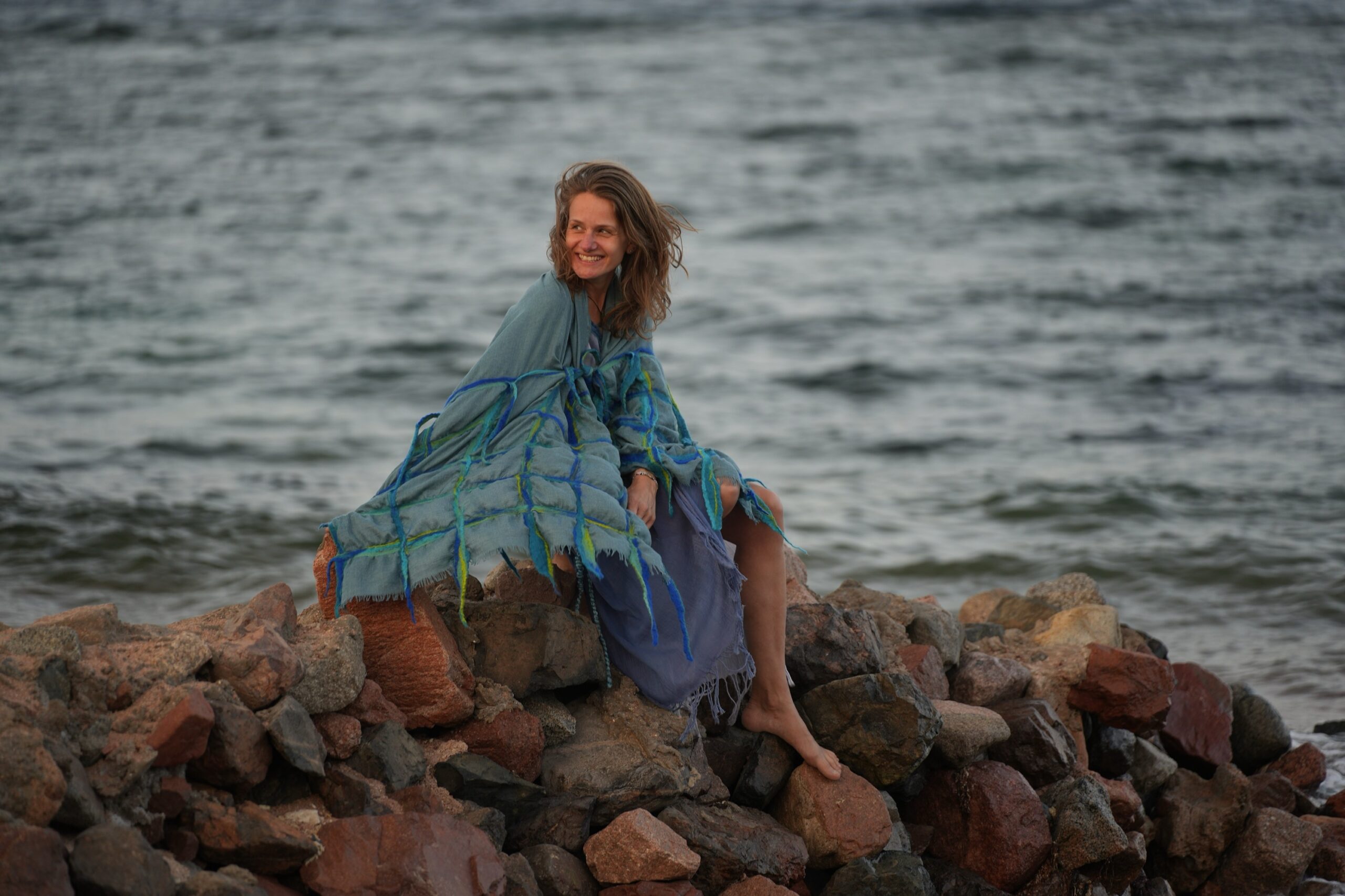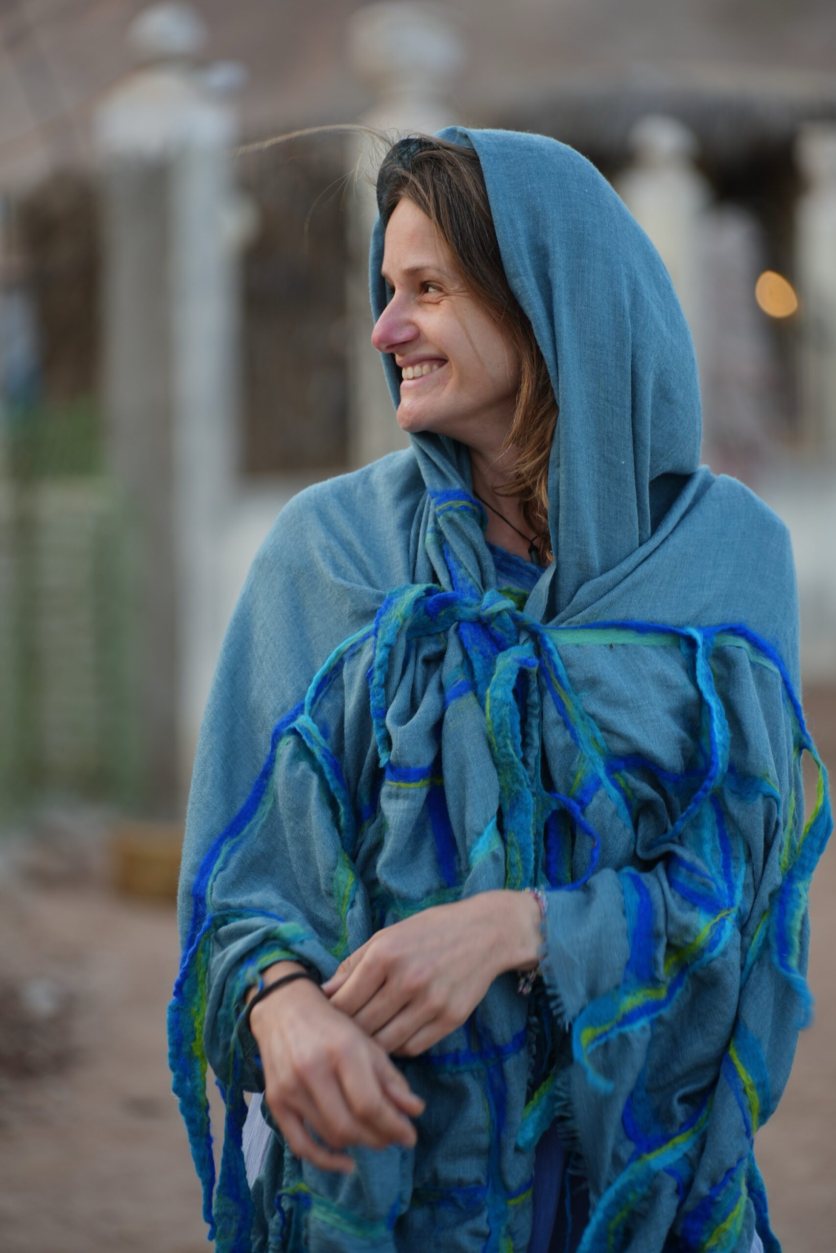 Shades of blue and green wool felted on a Kashmir scarf 1.00 X 2.10
