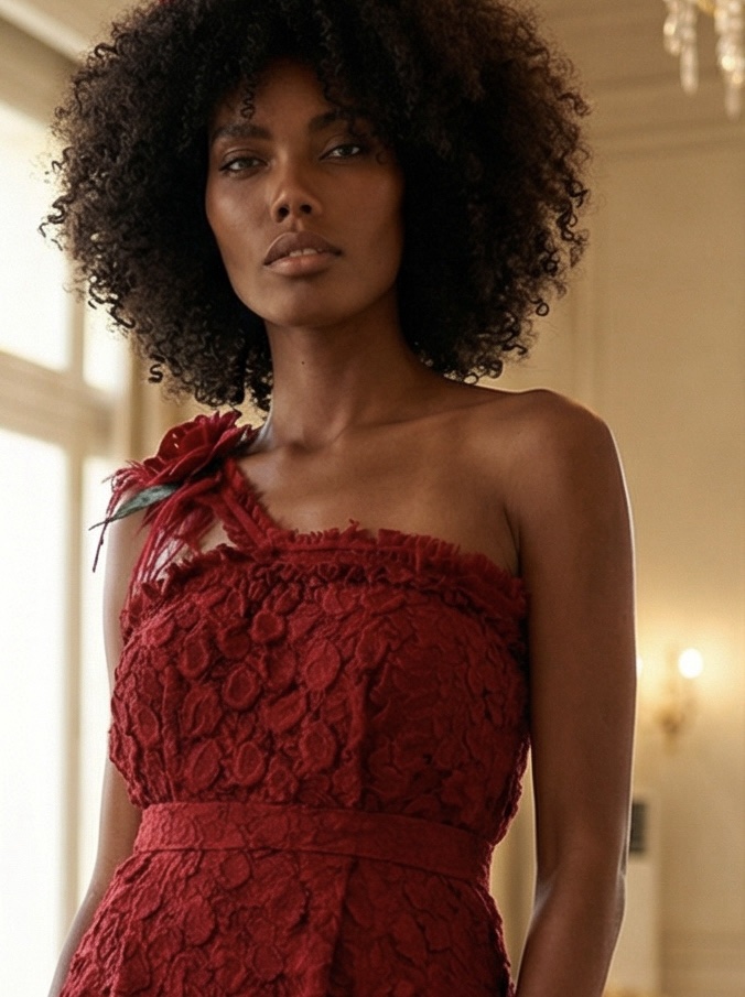 This linen ruby dress has been manipulated with heat giving it a 3D effects! The hems are all felted with merino wool and decorated with red roses and wool threads falling off the shoulder