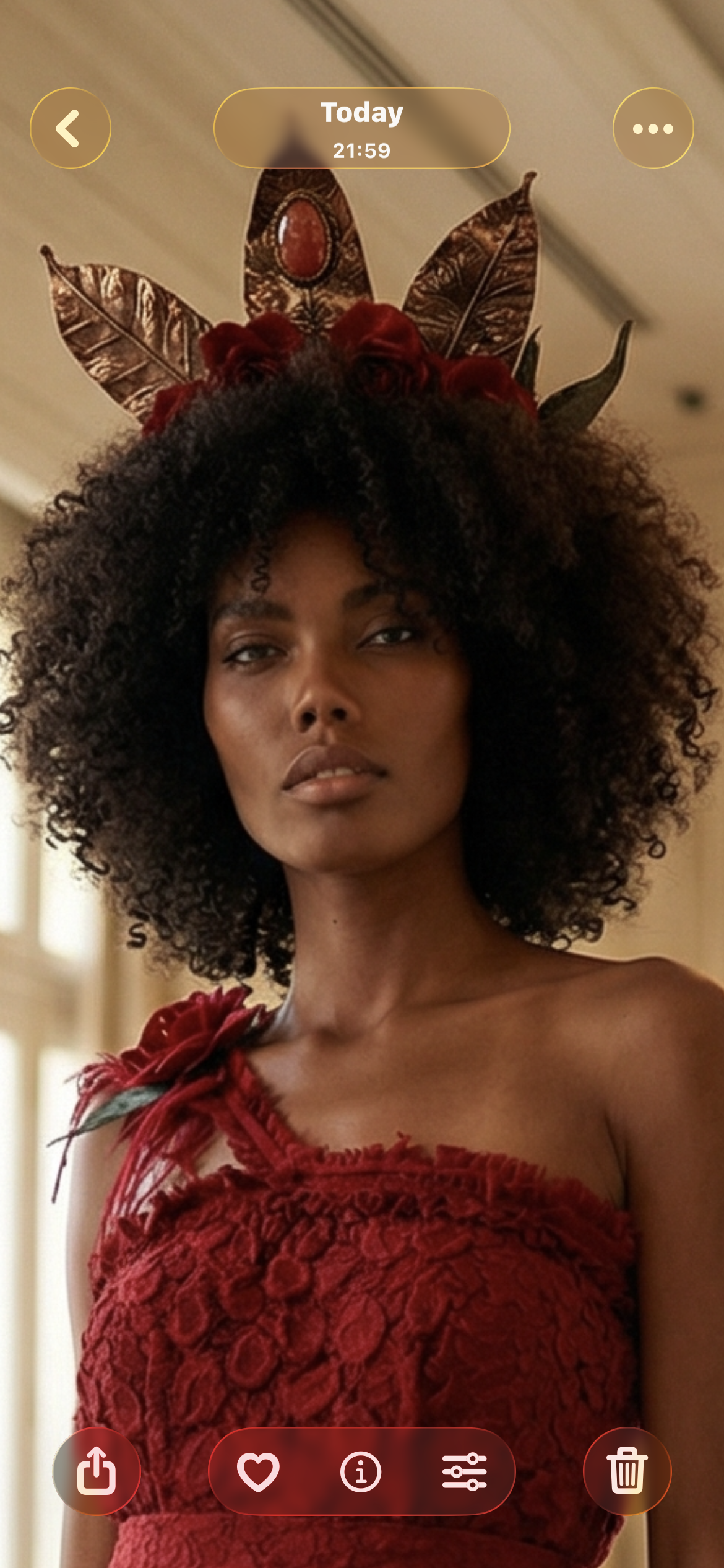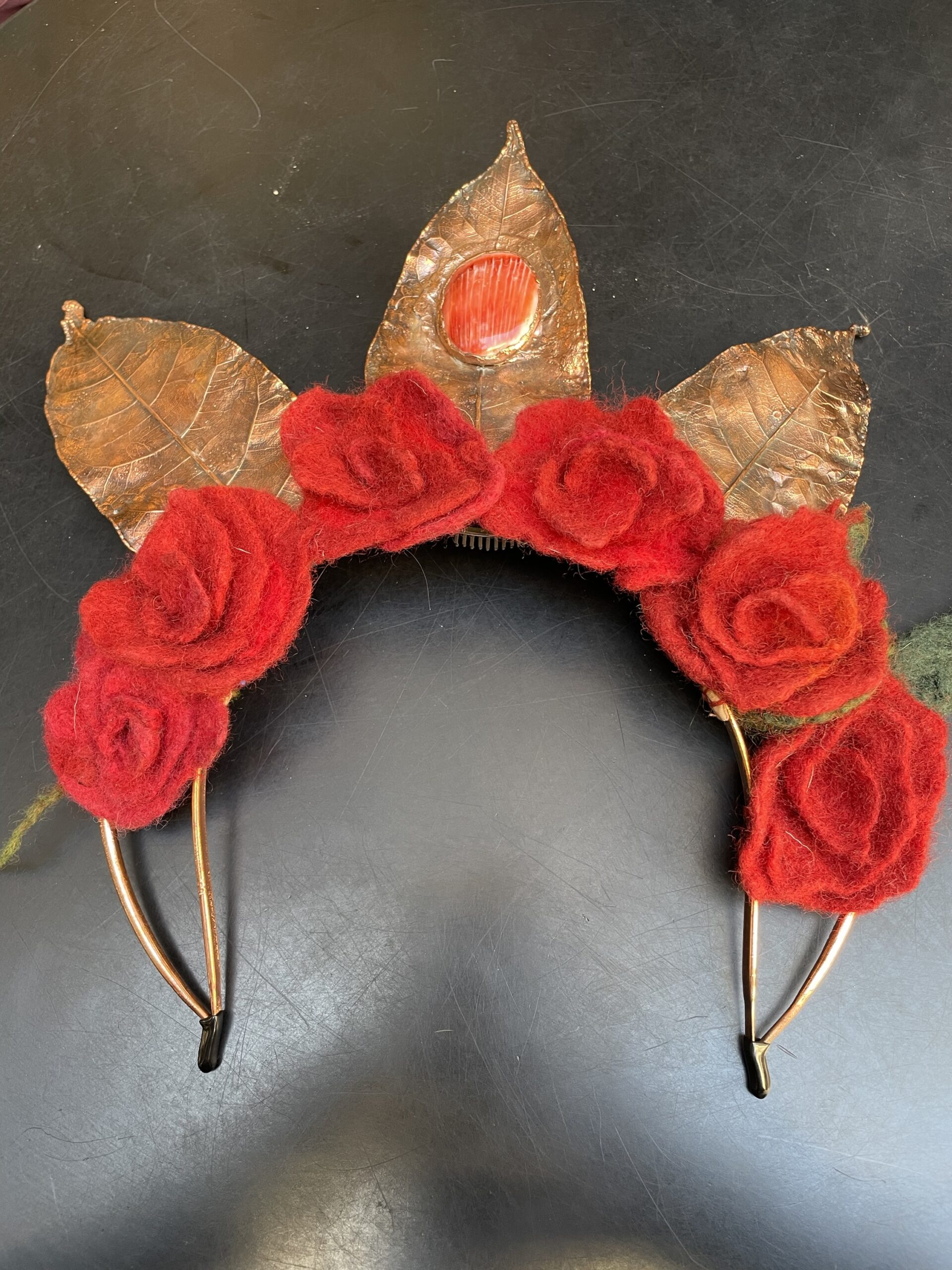 The tiara has 6 red roses and 3 handmade metallic leaves! The stone in the center is a sea shell called spiny oyster